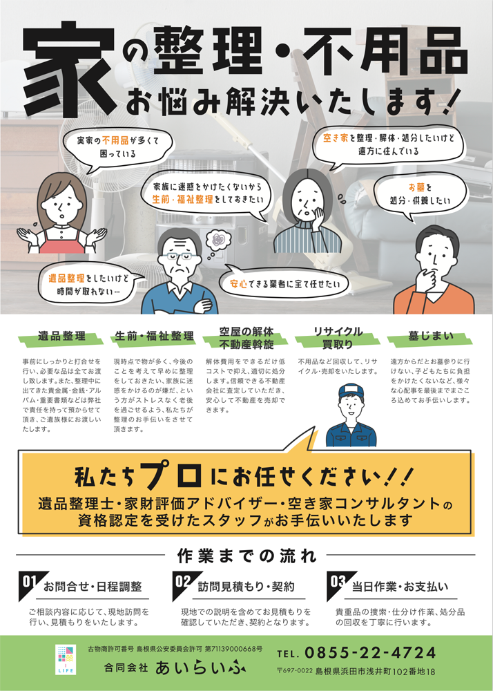 島根県浜田市を拠点として遺品整理業をメインで活躍しています。